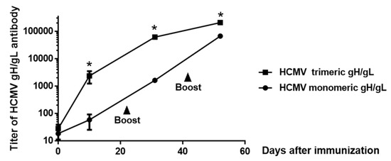 We directly compared HCMV monomeric and trimeric gH/gL for the elicitation of total serum titers of gH/gL-specific IgG. Groups of five adult rabbits each were immunized subcutaneously with 25 µg of HCMV monomeric or trimeric gH/gL recombinant protein adjuvanted with alum + CpG-ODN, and then boosted in a similar fashion on days 21 and 42 post-immunization. The CpG-ODN sequence was optimized for use in rabbits [48]. As illustrated in Figure 3, both the HCMV monomeric and trimeric gH/gL proteins induced augmented serum IgG responses following the first booster immunization, and further significant augmentation in serum IgG titers following the second booster immunization. HCMV trimeric gH/gL induced 29-fold and 38-fold higher serum gH/gL-specific IgG titers relative to monomeric gH/gL following the primary immunization and the first booster immunization respectively, with the difference of titers decreased to threefold after the second booster immunization (Figure 3). These data are consistent with our previous study in mice and rabbits using monomeric and multimeric EBV envelope proteins gp350 and gH/gL, in which the multimerization of proteins induced a marked increase in immunogenicity [43,47].