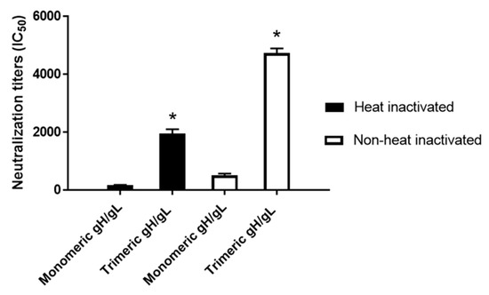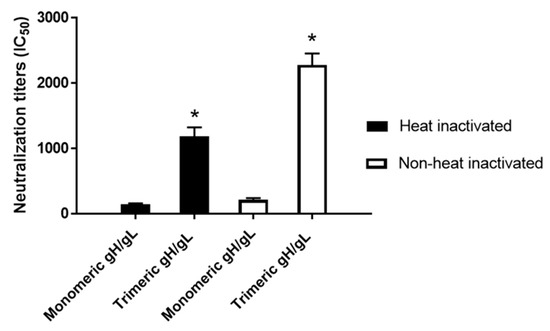 The HCMV-neutralizing antibodies of day 52 sera from the rabbits immunized with three doses of 25 µg each of HCMV trimeric versus monomeric gH/gL were also analyzed using MRC-5 fibroblasts and HCMV strain AD169wt131. Sera from trimeric gH/gL-immunized rabbits, in the absence of heat inactivation to preserve complement activity, demonstrated 10.5-fold higher serum titers of HCMV-neutralizing activity relative to sera from monomeric gH/gL-immunized rabbits (Figure 5). After heat inactivation at 56 °C for 30 min to inactivate the complement, the titers of HCMV-neutralizing activity slightly decreased for both groups, where the trimeric relative to the monomeric gH/gL group still demonstrated eightfold higher serum titers of HCMV-neutralizing activity (Figure 5).