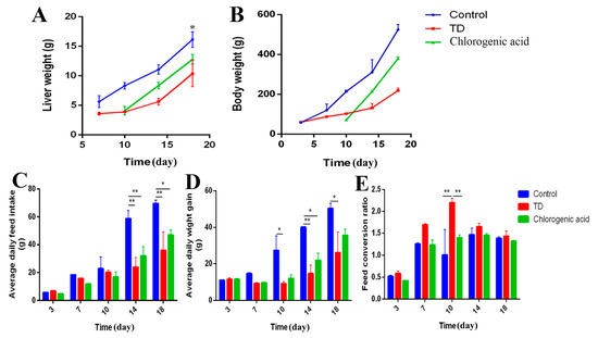 It can be found that there is a similar varying tendency among average daily feed intake, body weight and liver weight in different periods. The average feed intake, body weight, and liver weight in the TD group were lower than in the control group, which indicates a decreased growing ability. However, the feed conversion ratio in the TD group was higher than the control group and chlorogenic acid group, especially at day 10 (** p < 0.01), which represents a fast-growing period in TD development. After the application of chlorogenic acid, the growth of broilers was significantly promoted (p < 0.05), and the feed conversion ratio became normal compared with the TD group, while CGA significantly (p <0.05) increased the ADFI and FCR of TD-affected chickens (Figure 2). This evidence indicates that TD-affected chickens taking the chlorogenic acid display a healthy and positive growth state.