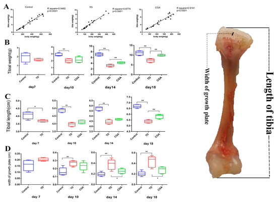 Linear regression analysis showed a commonly significant (p < 0.05) positive correlation between body weight and tibia weight of chickens in the control, TD and CGA groups (Figure 3A). To evaluate tibial parameters precisely, tibial weight, tibial length, as well as the width of tibial growth plate were measured at days 7, 10, 14 and 18. In the TD group, tibial weight and tibial length were significantly decreased (p < 0.01) in comparison to the control group because of abnormal development. After the continuous treatment of CGA, tibial weight and tibial length in CGA group had significant improvement compared with the TD group (p < 0.01) at day 18 (tibial weight from day 14). The width of tibial growth plate has a converse tendency with tibial weight and tibial length. This index in the TD group was significantly higher than in the control group from days 10 to 18 due to delayed calcification and the appearance of avascular cartilage plug in growth plate. From day 14, CGA gradually diminished the width of tibial growth plate significantly between the TD group and CGA group (Figure 3).