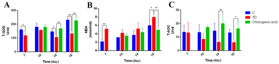 Chlorogenic acid improves antioxidant level of chickens. (A–C) Antioxidant activities analysis of serum samples in Control, TD and CGA groups on days 7, 10, 14 and 18. T-SOD represents the vitality of total superoxide dismutase, MDA represents the concentration of malonic dialdehyde, and T-AOC represents the total antioxidant capacity. The data are expressed as means ±SD. * p < 0.05, ** p < 0.01.
