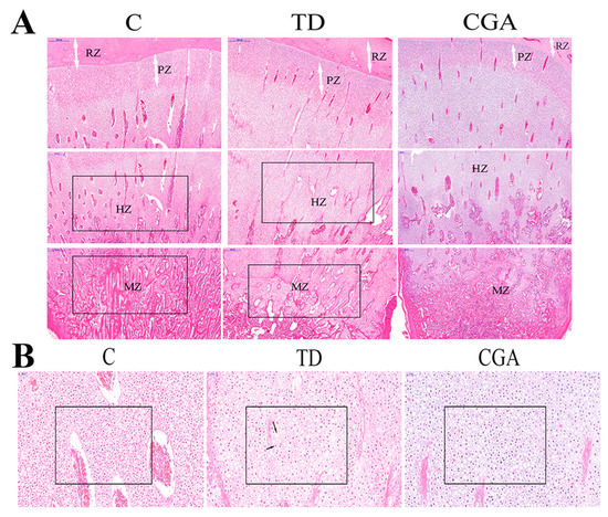 We compared the same region of tibia in three groups. The difference of cell growth can be easily found. Compared with the dense cell distribution in the control group, cells in the TD group were sparser, while there were many dead cells accumulated in the growth plate without nuclei in the TD group. Moreover, there were much more red-stained-nuclei cells in the TD group than in the control group, and the red color indicates nuclear degeneration or cellular apoptosis. After a comparison between the control group and the TD group, the TD group had a higher proportion of extracellular matrix than the control group. When it came to the calcification area, at same region of the control group and TD group, the TD group had delayed calcification compared with the control group. However, conditions became different in the CGA group where the number of cells is increased, and there are fewer red-stained cellular nuclei. Further, the proportion of extracellular matrix is decreased (Figure 5).