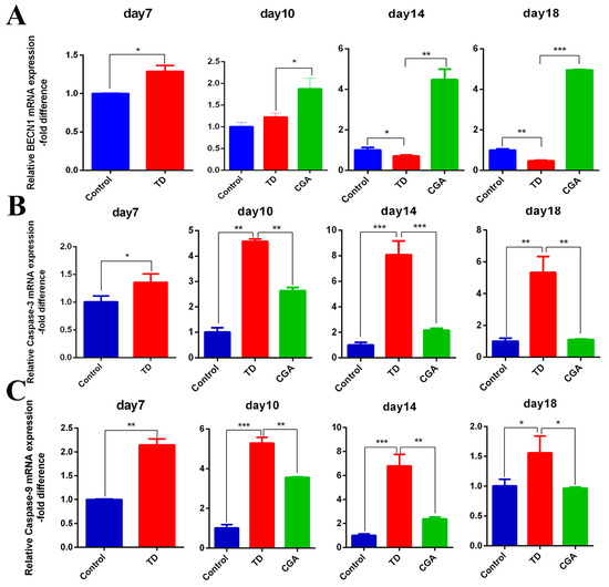 Gene expression of caspase-3, caspase-9, BECN-1 were confirmed by RT-qPCR. Our results showed that mRNA expression of pro-apoptotic genes caspase-3 and caspase-9 are significantly increased in TD group compared with the control group at days 7, 10, 14, and 18. The mRNA expression of autophagic gene BECN1 in the TD group were significantly lower than in the TD group from day 14. In contrast, after application of chlorogenic acid from day 7, the expression of caspase-3 and caspase-9 began to decline and it significantly decreased from day 10 (especially on day 14) compared with the TD group. The expression level of BECN1 in the CGA group had a continuous raised tendency and a significant difference appeared at day 10 compared with the TD group. Obviously, the expression of apoptotic genes caspase-3 and caspases-9 gradually approached the expression level of the control group until day 18 (Figure 6).