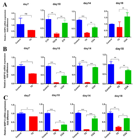 To investigate the effect of CGA on ECM catabolism, we chose some representative genes from matrix metalloproteinase, MMP-9, MMP-10, and MMP-13. The expression of MMPs we chose significantly down-regulated in TD group from days 10 to 14 when compared with the control group, MMP-10 and MMP-13 showed more obvious reduction. The administration of CGA resulted in a significant up-regulation of these three MMPs genetic expression in the CGA group as compared with the TD group. The expression of MMP-10 and MMP-13 in CGA group became similar to the control group, but the expression of MMP-9 is still high (Figure 7).
