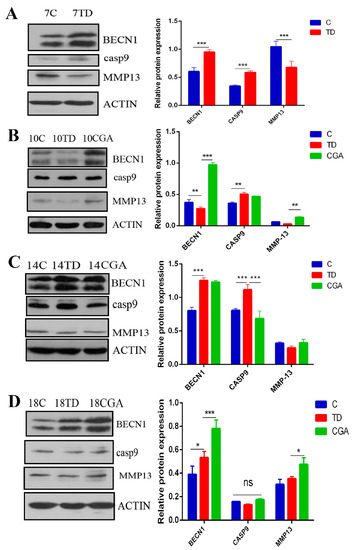 The protein expression of BECN1, CASP9 and MMP13 were assessed by western blotting on days 7, 10, 14 and 18. The expression level of the pro-apoptotic protein, CASP-9 was significantly enhanced in the TD group, whereas the expression of MMP13 protein was reduced on days 7, 10, 14, 18. However, the administration of CGA significantly decreased the expression level of CASP-9 on day 14 and obviously increased the level of MMP13 on day 10 compared with the TD group. The expression of BECN1 was down-regulated in the TD group on day 10, whereas CGA up-regulated the level of BECN1 significantly from day 10 to day 18 compared with the control group (Figure 8).