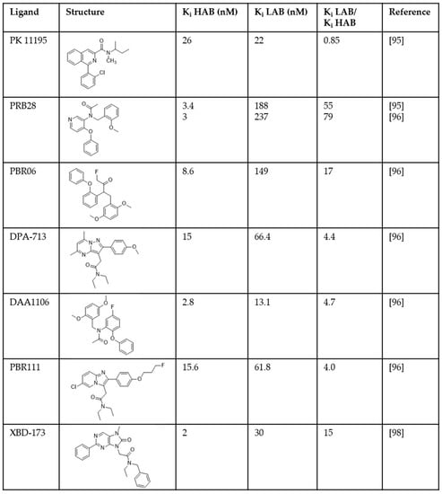 One source of failure in these clinical trials was attributed to large inter-individual variability in PET signal. Second-generation TSPO ligands such as PBR-28, DPA-713, and DAA1106 showed three different binding patterns in tissue from human donors. These ligands bound with high affinity to the tissue from ~50–65% of donors (high affinity binders; HABs) and with low-affinity, or not at all, to tissue from ~5–25% of donors (low affinity binders; LABs) (Figure 1) [,,]. A third group (~30%; mixed affinity binders; MABs) displayed binding of these ligands in a two-site manner for some ligands, or with a Ki close to half-way between HABs and LABs for other ligands [,,].