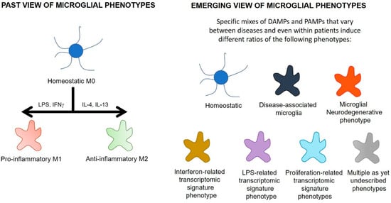 The changing paradigm of microglial phenotypes. DAMPs = danger-associated molecular patterns; PAMPs = pathogen-associated molecular patterns; LPS = lipopolysaccharide; IFNγ = interferon-γ, IL-4 = interleukin-4, IL-13 = interleukin-13.