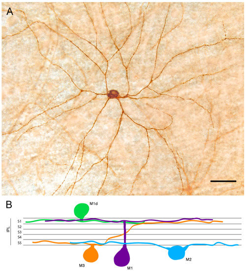 Melanopsin-containing ganglion cells are distributed throughout the inner nuclear and ganglion cell layers of the retina [45,46,47]. They can be classified into different cell subtypes depending on the location of their dendritic arborization within the inner plexiform layer (IPL), their retinal connections, and light responses [48,49,50]. According to morphological and physiological features, six types of melanopsin ganglion cells (M1 to M6) have been identified [6,50,51,52,53,54,55,56,57,58]. Three of these cell classes (M1, M2, and M3) have been described using traditional immunohistochemistry methods [37,42,59,60,61,62,63], while M4, M5, and M6 types express levels of melanopsin that are too low to be reliably detected by conventional immunostaining. These last types have been mainly detected by using signal-amplification immunolabeling methods or mouse reporter lines expressing fluorescent proteins under specific promoters. M1 cell dendrites stratify exclusively in the outer margin of the IPL (stratum S1), M2 cells project their dendrites to the inner margin of the IPL (stratum S5), and the less abundant M3 cells stratify in both the outer and inner margins of the IPL (S1 and S5, respectively). Nonetheless, the inclusion of M3 cells as a distinct melanopsin cell type remains controversial due to their lower density and their morphological and functional similarities with M2-type cells, so that the bistratified population of melanopsin cells has been suggested not to be an independent cell type [51,64,65]. Most subtypes of melanopsin-positive cells have the cell body in the ganglion cell layer (GCL) of the retina, but a population of M1 cells has the soma located in the inner nuclear layer (INL) [66]. These cells are called displaced M1 cells (M1d). The typical morphology of an M1d cell and a schematic representation of mRGC types revealed by conventional immunostaining are shown in Figure 1.
