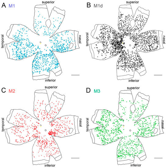 Melanopsin-containing ganglion cells on the human retina: (A–D) Representative drawings of a 56-year-old wholemount human retina showing the location of immunostained individual melanopsin-positive cells of different types. Each dot represents one mRGC and the color code indicates different mRGC types. Scale bar: 5 mm. (Modified from Esquiva et al., 2017) [37].