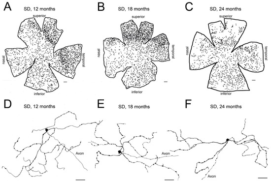 Age-related changes of melanopsin ganglion cells in control Sprague–Dawley rat retinas: (A–C) Representative drawings of wholemount retinas from Sprague–Dawley (SD) rats at 12 (A), 18 (B), and 24 (C) months-of-age. (D–F) Representative drawings of the soma and complete dendritic field of mRGCs from a region of the central retina (between the superior and nasal quadrants) of Sprague–Dawley rats at 12 (D), 18 (E), and 24 (F) months-of-age. Drawings were made using a camera lucida and reveal immunostained mRGCs. Scale bar: A–C, 500 μm; D–F, 50 μm. (Modified from Lax et al., 2016) [63].