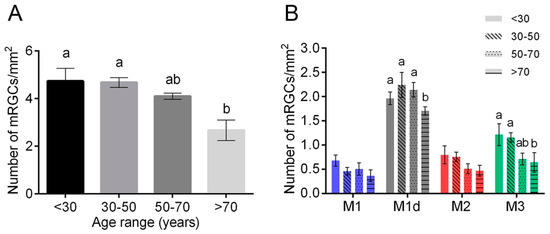 Age-related changes of melanopsin ganglion cells in human retinas: (A,B) Mean density of total mRGCs (A) and different types of mRGCs (B) in human retinas between 10 and 81 years-of-age. Different letters above the histograms indicate statistically significant differences between ages (p < 0.05). (Modified from Esquiva et al., 2017) [37].