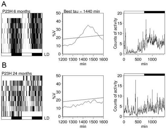 Circadian rhythms of locomotor activity in P23H line 1 rats: (A,B) Example of actograms (left panels), periodograms (middle panels), and mean waveforms (right panels) at the ages of 6 (A) and 24 (B) months for a P23H-1 rat exposed to a 12:12 LD cycle. All data were obtained from the same animal. Light and dark schedules are represented by white and dark bars, respectively. (Modified from Lax et al., 2016) [63].