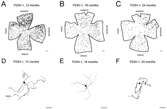 Age-related changes of melanopsin ganglion cells in P23H line 1 rat retinas: (A–C) Representative drawings of wholemount retinas from P23H-1 rats at 12 (A), 18 (B), and 24 (C) months-of-age. (D–F) Representative drawings of the soma and complete dendritic field of mRGCs from a region of the central retina (between the superior and nasal quadrants) of P23H-1 rats at 12 (D), 18 (E), and 24 (F) months-of-age. Scale bar: A–C, 500 μm; D–F, 50 μm. (Modified from Lax et al., 2016) [63].