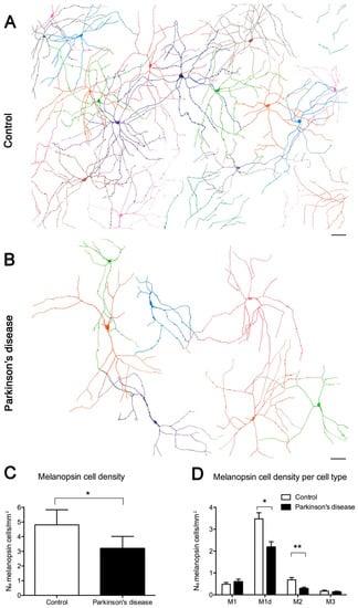 Melanopsin ganglion cells in Parkinson’s disease (PD): (A–B) Representative drawings of control and PD retinal fields. (A) Melanopsin plexus in a control wholemount retina. (B) Melanopsin plexus in a PD wholemount retina. Each color defines an individual mRGC. (C) Total mRGC quantification (number of mRGCs per mm2) and comparison between control and PD subjects. (D) Comparison of the mRGC density per cell type in control and PD subjects. Scale bar, 100 μm. (Modified from Ortuño-Lizarán et al., 2018) [42].