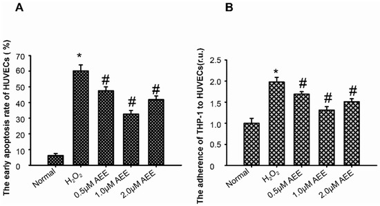 AEE reduced the apoptosis of HUVECs and decreased the H2O2-induced adherence of THP1 cells to HUVECs. (A) AEE reduced the apoptosis of HUVECs induced by H2O2. Values are presented as the means ± SD where applicable (n = 6). * p < 0.05 compared with the normal group; # p < 0.05 compared with the H2O2 group. (B) AEE decreased the H2O2-induced adherence of THP1 cells to HUVECs. Values are presented as the means ± SD where applicable (n = 6). All data were normalized to the corresponding control and reported in relative units (r.u.).