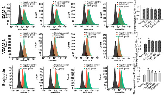 AEE decreased H2O2-induced E-selection expression in HUVECs. Values are presented as the means ± SD where applicable (n = 8). * p < 0.05 compared with the normal group; # p < 0.05 compared with the H2O2 group. All data were normalized to the corresponding control and in relative units (r.u.).