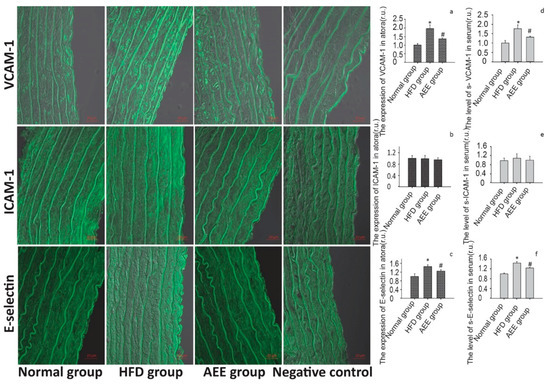 AEE reduced the expression of adhesion molecules in rats fed the HFD. (a–c): AEE reduced VCAM-1 and E-selectin expression in the aorta. Values are presented as the means ± SD where applicable (n = 8). * p < 0.05 compared with the normal group; # p < 0.05 compared with the HFD group. All data were normalized to the corresponding control and reported in relative units (r.u.). (d–f): AEE decreased the serum sVCAM-1 and sE-selectin levels. Values are presented as the means ± SD where applicable (n = 8). * p < 0.05 compared with the normal group; # p < 0.05 compared with the HFD group. All data were normalized to the corresponding control and reported in relative units (r.u.).
