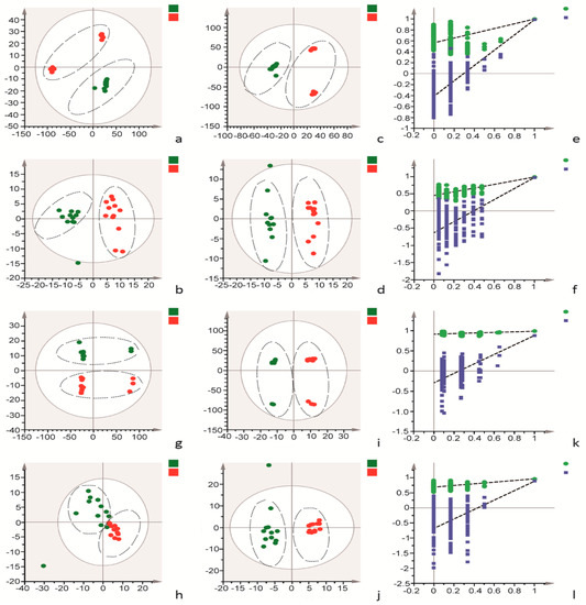 The results from the cellular metabolomics analysis were similar to the results obtained from cell culture supernatant samples. Typical TICs of cellular extracts in positive and negative modes are shown in Supplementary materials. As shown in the PCA score plots, clear boundaries between the normal group and AEE group were observed in the absence of H2O2 in both positive and negative modes (Figure 4g,h). A clear separation among the normal, H2O2 and AEE groups was observed (Figure 5g,h). As shown in score plots of OPLS-DA models (Figure 4i,j and Figure 5i,j), clear compartmentation was also observed among the different treatment groups in the absence or presence of H2O2. Moreover, none of the OPLS-DA models were overfitted, according to the results of the permutation test, as shown in Figure 4k,l and Figure 5k,l. The Q2 regression line has a negative intercept, and all permuted R2 values located to the left of the intercept were lower than the original point to the right of the intercept.