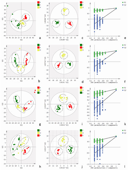 Multivariate analyses of data from the UPLC-Q-TOF/MS analysis of cell and cell culture supernatants stimulated with H2O2. (a,b): PCA score plots based on cell culture supernatant metabolic profiles of the normal, H2O2 and AEE groups in positive and negative modes, ESI+: R2 = 0.527, ESI−: R2 = 0.593. (c,d): OPLS-DA score plots of the normal, H2O2 and AEE groups in positive and negative modes, ESI+: R2X = 0.392, R2Y = 0.975, Q2 = 0.862; ESI−: R2X = 0.511, R2Y = 0.966, Q2 = 0.848. (e,f): Permutation test of the OPLS-DA model, ESI+: the intercepts of R2 = 0.751 and Q2 = −0.427, ESI−: the intercepts of R2 = 0.675 and Q2 = −0.422. (g,h): PCA score plots based on the cellular metabolic profiles of the normal, H2O2 and AEE groups in positive and negative modes, ESI+: R2 = 0.56, ESI−: R2 = 0.668. (i,j): OPLS-DA score plots of normal and AEE groups in positive and negative modes, ESI+: R2X = 0.4, R2Y = 0.911, Q2 = 0.836; ESI−: R2X = 0.531, R2Y = 0.924, Q2 = 0.814. (k,l): Permutation test of the OPLS-DA model, ESI+: the intercepts of R2 = 0.568 and Q2 = −0.0.375, ESI−: the intercepts of R2 = 0.518 and Q2 = −0.545. Z: normal group; B: AEE group; H: H2O2 group.