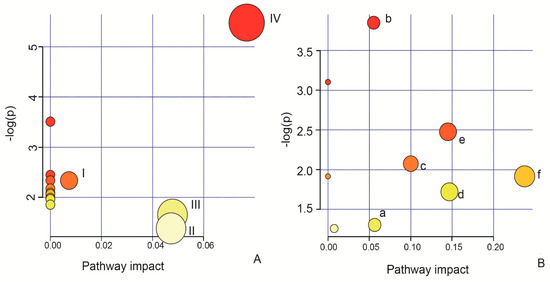 Results of the pathway analysis of the potential biomarkers in cells and cell culture supernatants. (A) Effect of AEE on possible metabolic pathways in the absence of H2O2. I: Phenylalanine, tyrosine and tryptophan biosynthesis; II: tyrosine metabolism; III: cysteine and methionine metabolism; and IV: valine, leucine and isoleucine biosynthesis. (B) Effect of AEE on possible metabolic pathways disturbed by H2O2. a: Aminoacyl-tRNA biosynthesis; b: cysteine and methionine metabolism; c: lysine biosynthesis; d: lysine degradation; e: riboflavin metabolism; and f: glutathione metabolism.