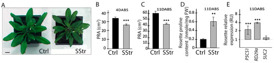 To study the effects of high salinity during the reproductive stage, the plants were maintained in standard growth conditions during the vegetative stage and plants were transferred, one day before the onset of the floral bud, to a high salinity but with a concentration (150 mM NaCl) that Arabidopsis plants can withstand [34,40]. In these conditions (Figure 1A), the projected rosette area (PRA) after 4 and 11 days of salt treatment (SStr) was reduced by 22% and 31%, respectively, compared to the Ctrl plants, respectively (Figure 1B,C). Another effect of salt treatment was a higher accumulation of proline in the rosette leaves of SStr plants at 11 days after the beginning of salt treatment (DABS) compared to Ctrl plants (Figure 1D), a typical response to salt stress. In agreement with these data, we observed a higher accumulation of the transcripts of P5CS1, which encodes the ‘delta1-PYRROLINE-5-CARBOXYLATE SYNTHASE 1’, a key enzyme of the proline biosynthesis [41] and of ‘RESPONSIVE TO DESSICATION 29a’ gene (RD29a), another stress marker [42]. However, salinity had no effect in the rosette leaves on the transcript level of SUC2 (SUCROSE TRANSPORTER2) that encodes the main phloem-loading sucrose transporter in Arabidopsis (Figure 1E), indicating that the capacity of the rosette to maintain carbon allocation to sink organs is maintained.