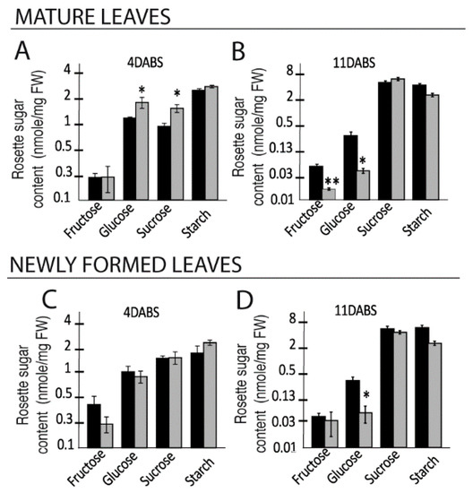 We also examined the accumulation of soluble sugars in mature and newly-formed rosette leaves (Figure 2). At four days after the beginning of salt treatment (DABS), glucose and sucrose content was higher in the mature leaves of stressed plants compared to control plants (Figure 2A), while at 11 DABS, fructose and glucose content in SStr plants was significantly lower than in Ctrl plants (Figure 2B). In the younger leaves that had emerged during salt treatment, sugar content at 4 DABS was similar in Ctrl and SStr plants (Figure 2C) but by 11 DABS the glucose content was lower, just as for mature leaves at that stage (Figure 2B,D). There was no effect of salt treatment on starch content in either mature or young leaves, whenever they were sampled (Figure 2).