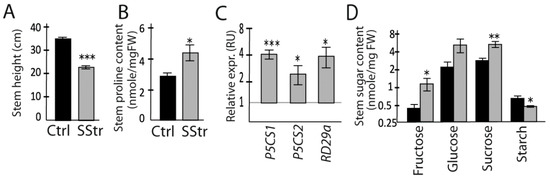 Responses in the stem to high salinity. Growth, proline content, sugar content and gene expression in the stem of Ctrl and SStr plants, with black bars for Ctrl plants and grey bars for SStr plants. (A) Stem height. (B) Proline content. (C) Relative expression (relative expr.) of P5CS1, P5CS2, and RD29a. For each gene, the relative transcript accumulations were normalized by the mean value of control plants. (D) Sugar and starch contents. Values represent means ± SE (n = 5–6 except for sugar and starch content n = 4–6). Asterisks indicate significant difference of treatments compared to control plants (* p < 0.05; ** p < 0.01; *** p < 0.001).