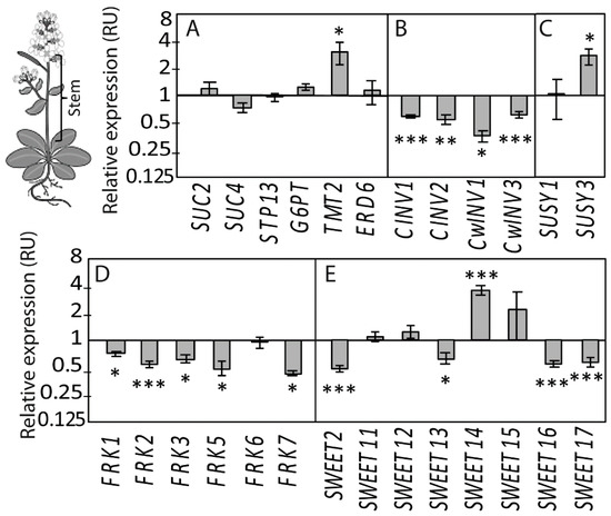 We first selected a subset of candidate genes associated with sugar metabolism and transport using in silico approaches and exploiting the available transcriptomic databases. We used the expression profiles generated in response to osmotic stresses in the BAR database [47], exploiting a dataset that was obtained in the shoot or roots of young seedlings treated for 24 h by cold, heat, drought or salt treatments (Supplementary Figure S1). We selected the TONOPLAST MONOSACCHARIDE TRANSPORTER2 (TMT2), SUGAR TRANSPORT PROTEIN 13 (STP13), GLUCOSE-6-PHOSPHATE/PHOSPHATE TRANSLOCATOR 2 (G6PT/GPT2) and EARLY RESPONSE TO DEHYDRATION 6 (ERD6) genes that are coding for monosaccharide transporters, eight SUGARS WILL EVENTUALLY BE EXPORTED (SWEET) genes, six FRUCTOKINASE (FRK) genes, two SUCROSE SYNTHETASE (SUSY) genes, two CYTOSOLIC INVERTASE (CINV) genes and two CELL WALL INVERTASE (CwINV) genes (Figure 4).