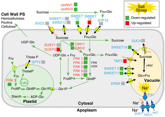 Scheme summarizing the expression data for genes involved in sugar transport (TMT2, SWEET2, SWEET13, SWEET14, SWEET16, SWEET17) and sugar homeostasis (cwINV1, cwINV2, SUSY3, CINV1, CINV2, FRK1, FRK2, FRK3, FRK5 and FRK7) in the heterotrophic stem tissue under high salinity. The figure shows changes in transcript accumulation in plants submitted to high salinity compared to controls. Red squares indicate genes upregulated in response to salt stress and green squares correspond to downregulated ones. Gray squares indicate genes with no significant changes. In blue letters: transporters and facilitators; in red letters: enzymes of the carbohydrate central metabolism. The main products of the corresponding transporters or enzymes are shown. FRK: fructokinase. HXK: hexokinase. SUSY: sucrose synthase. CINV: cytosolic invertase. cwINV: apoplasmic invertase. vINV: vacuolar invertase. UDP-Glc: UDP-glucose. Fru: fructose. Glc: glucose. ADP-Glc: ADP-Glucose. Glc1P: Glucose-1P. Glc6P: Glucose-6P. Fru6P: Fructose-6P. Calv. Calvin Benson Cycle. PS: polysaccharides. In response to high salinity, Na+ is transported from the apoplasm to the cytosol by NSCC channels and HKT transporters and in the vacuole by NHX1 Na+/H+ antiporters (blue circles), while the Na+/H+ antiporters SOS1 allow exclusion of Na+ across the plasma membrane [8,49,50].