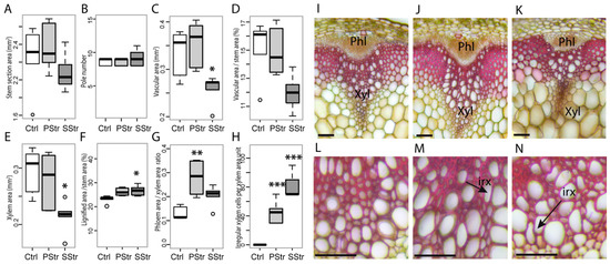 Stem anatomy in response to high salinity. Growth and anatomy of the stem of Ctrl, PStr and SStr plants, with black bars for Ctrl plants, light grey bars for PStr plants and dark grey for SStr plants. In (A) to (H), the box and whisker plots show the distribution of the biological replicates (n = 4 to 6). Inside black lines represent medians; the top and bottom ends of the boxes represent the first and the third quartiles, respectively; whisker extremities represent maximum and minimum data points and open circles represent outliers. (A) Area of the stem cross section. (B) Number of vascular bundles per stem section. (C) Total area of the vascular bundles per section. (D) Proportion of the vascular bundle area per total stem section area, expressed as a percentage. (E) Total xylem area per section. (F) Proportion of the lignified area (including interfascicular fibers and xylem) per total stem section area, expressed as a percentage. (G) Phloem area-to-xylem area ratios. (H) Number of irregular xylem cells-to-xylem section area ratio. A to H: *, ** and *** indicate significant difference of treatments compared to Ctrl plants (* p < 0.05; ** p < 0.01; *** p < 0.001). (I–N) Transversal cross section of basal stem stained with Safranin O and Alcyan Blue for Ctrl plants (I,L), Sstr plants (K,N) and PStr plants (J,M). Black arrows indicate the irx cells. Xyl: Xylem, Ph: Phloem. Bar = 50 µm.