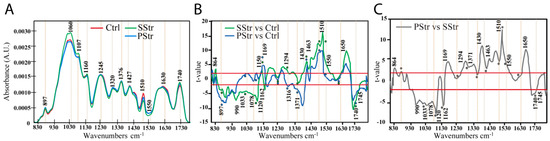 The t-values, plotted against each wavenumber of the spectrum (Figure 7B), showed that SStr plants exhibited significant differences at wavenumbers between 880 cm−1 and 1122 cm−1 compared to Ctrl plants, with several negative peaks (higher absorbance than in the control plants) at 917, 983, 1114 and 1160 cm−1. This region of spectra maps to various linkages of the (1,4)-β-D-glucan polymer [55], with the wavenumbers at 990, 1033, 1060, 1120 and 1162 cm−1 corresponding to cellulose [54] and wavenumbers at 864, 897, 945, 1078, 1150 and 1169 cm−1 corresponding also to hemicelluloses [54,55,56].