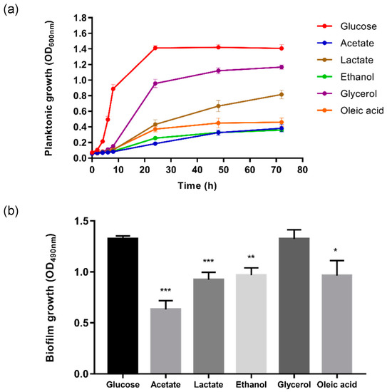 Alternative carbon sources modulate the planktonic and biofilm growth of C. glabrata. (a) Planktonic growth of C. glabrata in synthetic complete (SC) media supplemented with 2% glucose, 2% acetate, 2% lactate, 2% ethanol, 2% glycerol, or 0.2% oleic acid and incubated for 72 h at 37 °C; (b) Biofilm formation of C. glabrata in SC media supplemented with 2% glucose, 2% acetate, 2% lactate, 2% ethanol, 2% glycerol, or 0.2% oleic acid. Results were presented as means ± SD. * p < 0.05, ** p < 0.01 and *** p < 0.001 were considered statistically significant relative to the control (2% glucose). All experiments were conducted in triplicate, and each independent experiment was repeated three times.