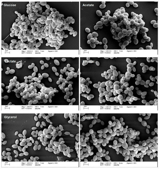 Next, we compared the biofilm growth of C. glabrata on the same carbon sources (Figure 1b). With the exception of glycerol, biofilm growth was reduced significantly on the alternative carbon sources tested when compared with the glucose control. Substantial reductions in biofilm growth were observed for C. glabrata on acetate (52.4%), lactate (30.3%), ethanol (26.9%), and oleic acid (27.3%), thereby confirming our previous report [23]. The ultrastructure of these biofilms was examined by SEM (Figure 2). The C. glabrata biofilms comprised only blastoconidia: no filamentous cells were observed. The aggregates of C. glabrata cells were smaller in biofilms grown in alternative carbon sources, consistent with the reduced growth on these carbon sources.