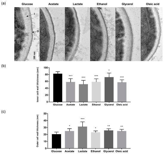 Alternative carbon sources alter the ultrastructure of the C. glabrata cell wall. (a) Representative transmission electron microscopy (TEM) images of cell wall architectures from C. glabrata grown on glucose and alternative carbon sources, [I] indicates inner cell wall layer (β-glucan and chitin) and [O] indicates outer cell wall layer (mannan). Scale bar represents 100 nm. (b) Quantification of thickness of the inner cell wall. (c) Quantification of the thickness of the outer cell wall. Results are presented as means ± SD from 10 individual cells by averaging 20 measurements obtained from the cell periphery of each C. glabrata cells. * p < 0.05, ** p < 0.01 and *** p < 0.001 were considered statistically significant relative to glucose-grown cells.