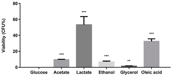 Alternative carbon sources reduce the susceptibility of C. glabrata to amphotericin B. Results are presented as means ± SD. ** p < 0.01 and *** p < 0.001 were considered statistically significant relative to glucose-grown cells.