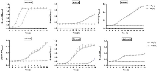 To assess the impact of carbon source on oxidative stress resistance, overnight cultures of C. glabrata grown in YPD were harvested and the cells washed twice with phosphate-buffered saline (PBS), pH 7.4, before resuspension in fresh SC media supplemented with glucose, acetate, lactate, ethanol, glycerol, or oleic acid as sole carbon source (OD600nm of 0.1). Then 200 µL of each C. glabrata cell suspension were transferred into a 96-well microtiter plate and H2O2 (Sigma-Aldrich, USA) added to a final concentration of 0 or 10 mM. Growth was then monitored for 24 h by measuring OD600nm with a microtiter plate reader (Thermo Fisher Scientific, USA).