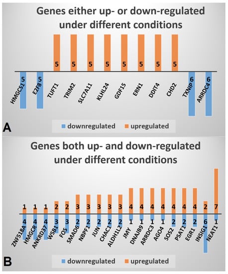 Genes most frequently differentially expressed under MTF treatment. The number of up- and/or down-regulated conditions is indicated at the frequency bars of each gene. (A) Genes either up- or down-regulated under different conditions. (B) Genes both up- and down-regulated under different conditions.