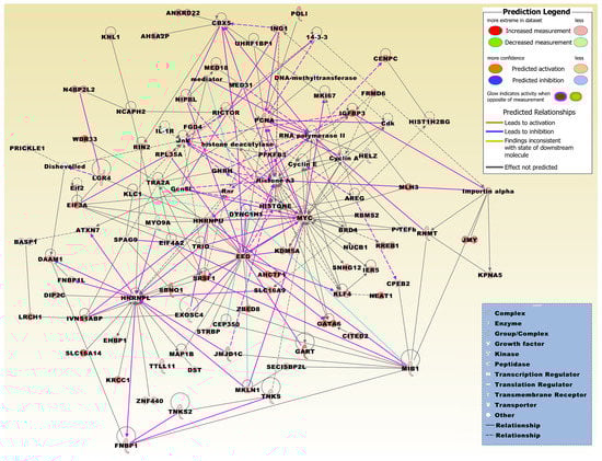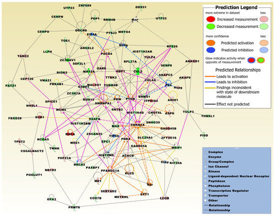 The merged network is based on the top three networks that were most significantly related to the microarray expression profiles of the set of 411 DEGs, which were both up- and down-regulated in at least two different conditions. Network molecules were related to, e.g., post-transcriptional and post-translational modification, DNA replication, recombination, and repair, cell-to-cell communication, cancer and other abnormalities, cellular growth, and carbohydrate metabolism (Table 2). Molecules derived from the 411 DEG set include AHCTF1, AHSA2P, ANKRD22, AREG, ATXN7, BASP1, BRD4, CBX5, CENPC, CEP350, CITED2, CPEB2, DAAM1, DIP2C, DST, DYNC1H1, EED, EHBP1, EIF3A, EIF4A2, EXOSC4, FGD4, FNBP1, FNBP1L, FRMD6, GART, GATA6, HELZ, HIST1H2BG, HNRNPL, HNRNPU, IER5, IGFBP3, ING1, IVNS1ABP, JMJD1C, JMY, KDM5A, KLC1, KLF4, KNL1, KPNA5, KRCC1, LGR4, LRCH1, MAP1B, MED18, MED31, MIB1, MKI67, MKLN1, MLH3, MYC, MYO9A, N4BP2L2, NCAPH2, NEAT1, NIPBL, NUCB1, PCNA, PFKFB3, POLI, PRICKLE1, RBMS2, RICTOR, RIN2, RNMT, RPL35A, RREB1, SBNO1, SECISBP2L, SLC16A14, SLC16A9, SNHG12, SPAG9, SRSF1, STRBP, TNKS, TNKS2, TRA2A, TRIO, TTLL11, UHRF1BP1, WDR33, ZBED8, and ZNF440. The network was overlaid with the molecule activity predictor to calculate further molecular effects, as outlined in the prediction legend. Interconnecting factors added from the Ingenuity Knowledge Base include 14-3-3 protein, cyclin dependent kinases (Cdk), cyclin A, cyclin E, dishevelled, DNA-methyltransferase, eukaryotic translation initiation factor 2 subunit alpha (Eif2), lysine acetyltransferase 2B (KAT2B; alias, Gcn5l), gonadotropin releasing hormone 1 (GNRH), HISTONE, histone deacetylase, histone h3, IL-1R, importin alpha, Jnk, mediator multiprotein complex, P-TEFb complex subunits, RNA polymerase II, and ribosomal 45S RNA clusters (Rnr).