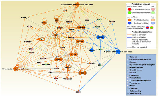 The regulator effects network had a consistency score of 7.3 and was significantly related to the microarray expression profiles of the 830 DEG set. Regulators include activating transcription factor 4 (ATF4), cyclin dependent kinase inhibitor 2A (CDKN2A), cAMP responsive element binding protein 1 (CREB1), E1A binding protein p400 (EP400), coagulation factor II, thrombin (F2), forkhead box O3 (FOXO3), G protein-coupled estrogen receptor 1 (GPER1), interferon gamma (IFNG), low density lipoprotein (LDL), notch receptor (Notch), and T-box 2 (TBX2). Molecules from the 830 DEG set involved in the network include CCNE1, CDC6, CDKN1A, CEBPB, CTH, CYR61, DMTF1, DUSP1, E2F2, E2F3, ETS1, FOXO1, GADD45A, IFIH1, IL1A, JAG1, KLF6, MAPK14, ME1, MXD1, NOTCH1, NQO1, PER1, PPP1R15A, PTEN, SLC19A1, and STAT3. The network was overlaid with the molecule activity predictor to calculate further molecular effects, as outlined in the prediction legend. The two functions, cytostasis of tumor cell lines and senescence of fibroblast cell lines, were predominantly activated whereas the function, S phase of fibroblast cell lines, was predominantly inhibited.