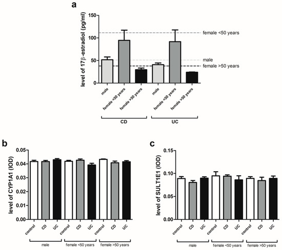 The pathogenesis of inflammatory bowel diseases remains elusive. There are a few main factors responsible for development of IBD, such as genetic and environmental factors which can lead to epithelial barrier dysfunction and dysregulation of immune response [23,24,25]. On the other hand, there is evidence of the anti-inflammatory effects of estrogens, especially the most active form, i.e., 17β-estradiol [16]. Bábičková et al. [26] found differences related to sex in dextran sodium sulfate (DSS)-induced experimental colitis that suggest a protective role of 17β-estradiol in the development and severity of disease. Male mice were found to be more prone to colitis, which was manifested by worse microscopic and stool score, colon shortening and a higher level of TNF-α in relation to DSS-treated females. We identified that the serum level of 17β-estradiol in both male and female patients with IBD under and over the age of 50 remains within the normal range. Similarly, our analysis revealed no changes in CYP1A1 protein level in CD and UC regardless of the sex and age of the patients. Next, the same level of SULT1E1 in men and women with IBD irrespective of age was observed. CYP1A1 and SULT1E1 are enzymes involved in estrogen catabolism. CYP1A1 is responsible for the hydroxylation of estrogens to 2-hydroxyestrogens which bind to estrogen receptors with less affinity compared to 17β-estradiol. SULT1E1 takes part in the sulfation pathway where it is responsible for the conversion of estrogens to inactive metabolite by conjugation of a sulfo-group to estrone and 17β-estradiol [27].