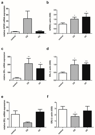 Expression of GPER (a,b), ERα (c,d) and ERβ (e,f) at the mRNA (a,c,e) and protein level (b,d,f) in CD and UC patients and the control group regardless of sex and age (control, n = 31; CD, n = 31; UC, n = 42). Values are means ± SEM; * P < 0.05, ** P < 0.01, *** P < 0.001 vs. control.