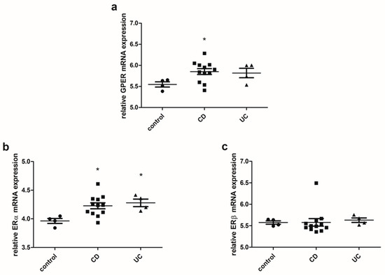 Expression of GPER (a), ERα (b) and ERβ (c) at the mRNA level in CD and UC patients and the control group regardless of sex and age (control, n = 4; CD, n = 12; UC, n = 4). Values are means ± SEM; * P < 0.05 vs. control.