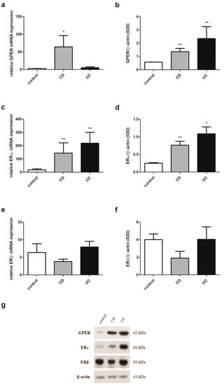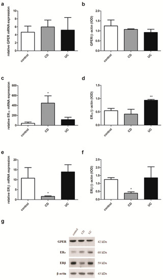 Expression of GPER (a,b), ERα (c,d) and ERβ (e,f) at the mRNA (a,c,e) and protein level (b,d,f) in females with CD and UC over the age of 50 years and related controls (control, n = 10; CD, n = 5; UC, n = 6). Representative immunoblots of GPER, ERα and ERβ (g). Values are means ± SEM; * P < 0.05, ** P < 0.01 vs. control.