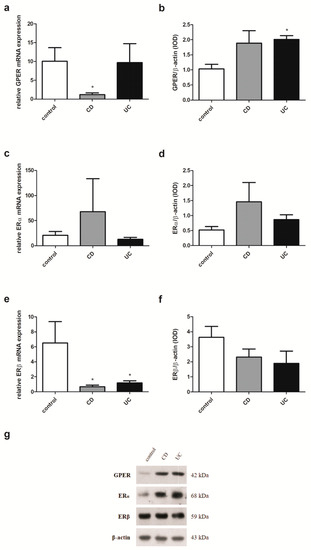 Expression of GPER (a,b), ERα (c,d) and ERβ (e,f) at the mRNA (a,c,e) and protein level (b,d,f) in females with CD and UC under the age of 50 years and related controls (control, n = 9; CD, n = 7; UC, n = 12). Representative immunoblots of GPER, ERα and ERβ (g). Values are means ± SEM; * P < 0.05 vs. control.