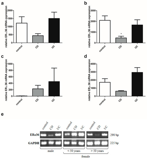 Expression of ERα36 at mRNA level in CD and UC patients and the control group regardless of sex and age (a; control, n = 31; CD, n = 31; UC, n = 42), males with CD and UC (b; control, n = 12; CD, n = 19; UC, n = 24), females with CD an UC under the age of 50 years (c; control, n = 9; CD, n = 7; UC, n = 12), females with CD and UC over the age of 50 years and related controls (d; control, n = 10; CD, n = 5; UC, n = 6). Representative agarose gel image of ERα36 expression (e). Values are means ± SEM; * P < 0.05 vs. control.
