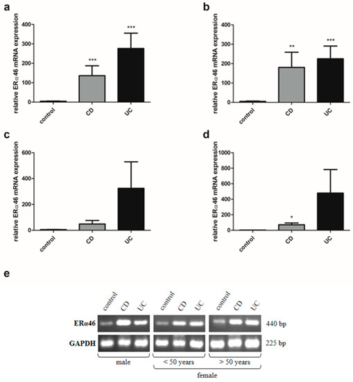 Expression of ERα46 at mRNA level in CD and UC patients and the control group regardless of sex and age (a; control, n = 31; CD, n = 31; UC, n = 42), male with CD and UC (b; control, n = 12; CD, n = 19; UC, n = 24), females with CD an UC under the age of 50 years (c; control, n = 9; CD, n = 7; UC, n = 12), females with CD and UC over the age of 50 years and related controls (d; control, n = 10; CD, n = 5; UC, n = 6). Representative agarose gel image of ERα46 expression (e). Values are means ± SEM; * P < 0.05, ** P < 0.01, *** P < 0.001 vs. control.