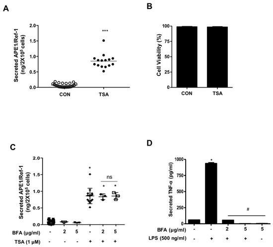 Initially, we determined the secretion of APE1/Ref-1 in trichostatin A (TSA)-treated HEK293T cells. The amount of secreted APE1/Ref-1 in culture supernatant, in response to deacetylase inhibitor, was quantitatively analyzed by enzyme-linked immunosorbent assay (ELISA), and the cell viability was analyzed by RealTime-GloTM MT assay to exclude the possibility of contamination from cell cycle progression. The results are summarized in Figure 1A,B. TSA concentrations used in the present study were within the range used previously to document the acetylation of intracellular proteins [9], without affecting the viability of HEK293T cells (Figure 1B). Interestingly, TSA-treated cells showed an increase in APE1/Ref-1 secretion (total amount of APE1/Ref-1, 0.85 ± 0.06 ng/2 × 105 cells) compared to the control cells (total amount of APE1/Ref-1, 0.07 ± 0.01 ng/2 × 105 cells) (Figure 1A). Since TSA induced APE1/Ref-1 secretion, we examined the effects of secretory pathway inhibitors on its secretion. Pre-exposure of TSA-treated HEK293T cells to brefeldin A (BFA), an inhibitor of the ER-to-Golgi classical transport pathway, had no effect on Ac-APE1/Ref-1 secretion (Figure 1C), whereas TNF-α secretion, which depends on the classical secretory pathway, was abrogated (Figure 1D). These results together indicated that TSA treatment increased APE1/Ref-1 secretion via non-classical transport pathways.