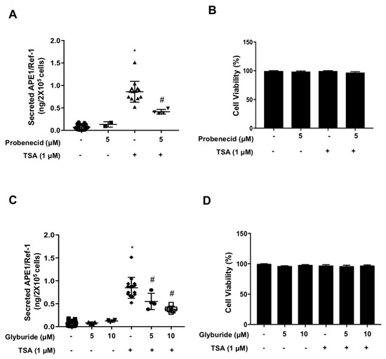 ABC transporters were used to transport a variety of substrates across cell membrane including ions, lipid, amino acids, even proteins [19]. As established APE1/Ref-1 secretion is mediated with non-classical transport pathway, we focused on the effect of an ABC transporter on APE1/Ref-1 secretion in TSA-treated HEK293T cells. As shown in Figure 2A, the secretion of APE1/Ref-1 from TSA-treated HEK293T cells was affected when the cells were pre-exposed to probenecid, a broad-spectrum inhibitor of ABC transporters. Probenecid-pretreated cells stimulated with TSA (0.39 ± 0.02 ng/2 × 10 5 cells) showed significantly inhibited APE1/Ref-1 secretion compared to TSA-only-stimulated cells (0.85 ± 0.06 ng/2 × 10 5 cells). As shown in Figure 2C, interestingly, APE1/Ref-1 secretion was also significantly reduced by more than 50% after pretreatment with glyburide [20,21], a selective inhibitor of ABC transporters such as ABCA1, ABCB1, ABCB11, ABCC1, ABCC2, ABCC3, ABCC8, and ABCC9 [22,23,24,25,26,27]. The exposure of two inhibitors did not affect cell viability, as shown in Figure 2B,D, respectively. These results strongly suggested that secretion of APE1/Ref-1 in TSA-treated HEK293T cells depends on the non-classical secretory pathway involving ABC transporters.