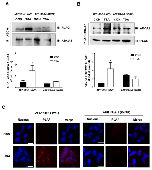 Interaction of ABCA1 and APE1/Ref-1 was visualized using a Duolink II fluorescence kit (Sigma-Aldrich, St Louis, MO, USA) as described previously [15], with some modifications. HEK293T cells expressing wild type APE1/Ref-1-FLAG [45] or mutant APE1/Ref-1(K6/7R)-FLAG [46] grown on glass coverslips were treated with TSA for 1h. After fixation and blocking the cells were incubated with a mixture of goat anti-ABCA1 antibody (1:200) and rabbit anti-APE1/Ref-1 antibody (1:500) overnight at 4 °C. For in situ analysis, conjugated oligonucleotides [PLA probe anti-goat minus (minus strand) plus anti-rabbit antibody (plus strand)] were added and incubated for 1 h at 37 °C. A negative control was prepared by adding anti-mouse IgG. Fluorescence confocal microscopic images of the cells were acquired using excitation/emission wavelengths of 590/670 nm for the PLA signal and 410/470 nm for the DAPI (Sigma-Aldrich, St Louis, MO, USA). Images were acquired with a confocal TCS SP8 X microscope (Leica, Wetzlar, Germany) with 40× oil immersion objective. Z-stack image were collected at 0.4 µm intervals. The obtained images were processed using Leica LAS X software (Leica, Wetzlar, Germany).