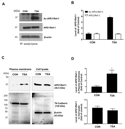 Next, we examined whether APE1/Ref-1 can be acetylated with TSA, and the trafficking of acetylated APE1/Ref-1(Ac-APE1/Ref-1) to the plasma membrane in HEK293T cells. Acetylation of APE1/Ref-1 in the response of TSA was analyzed with immunoblotting of APE1/Ref-1 after immunoprecipitation using anti-acetyl-lysine antibody (Figure 5A). TSA-treated cells showed about 4-fold higher quantities of Ac-APE1/Ref-1, compared with control cells (Figure 5B). Finally, we proceeded to examine the trafficking of APE1/Ref-1 to the plasma membrane in TSA-treated HEK293T cells. As shown in Figure 5C, TSA-induced APE1/Ref-1 enrichment was detected in the plasma membrane fraction and was confirmed using an anti-N-cadherin antibody. TSA-treated cells had an approximately 3-fold higher content of plasma membrane-located APE1/Ref-1 compared to the control cells (Figure 5D).